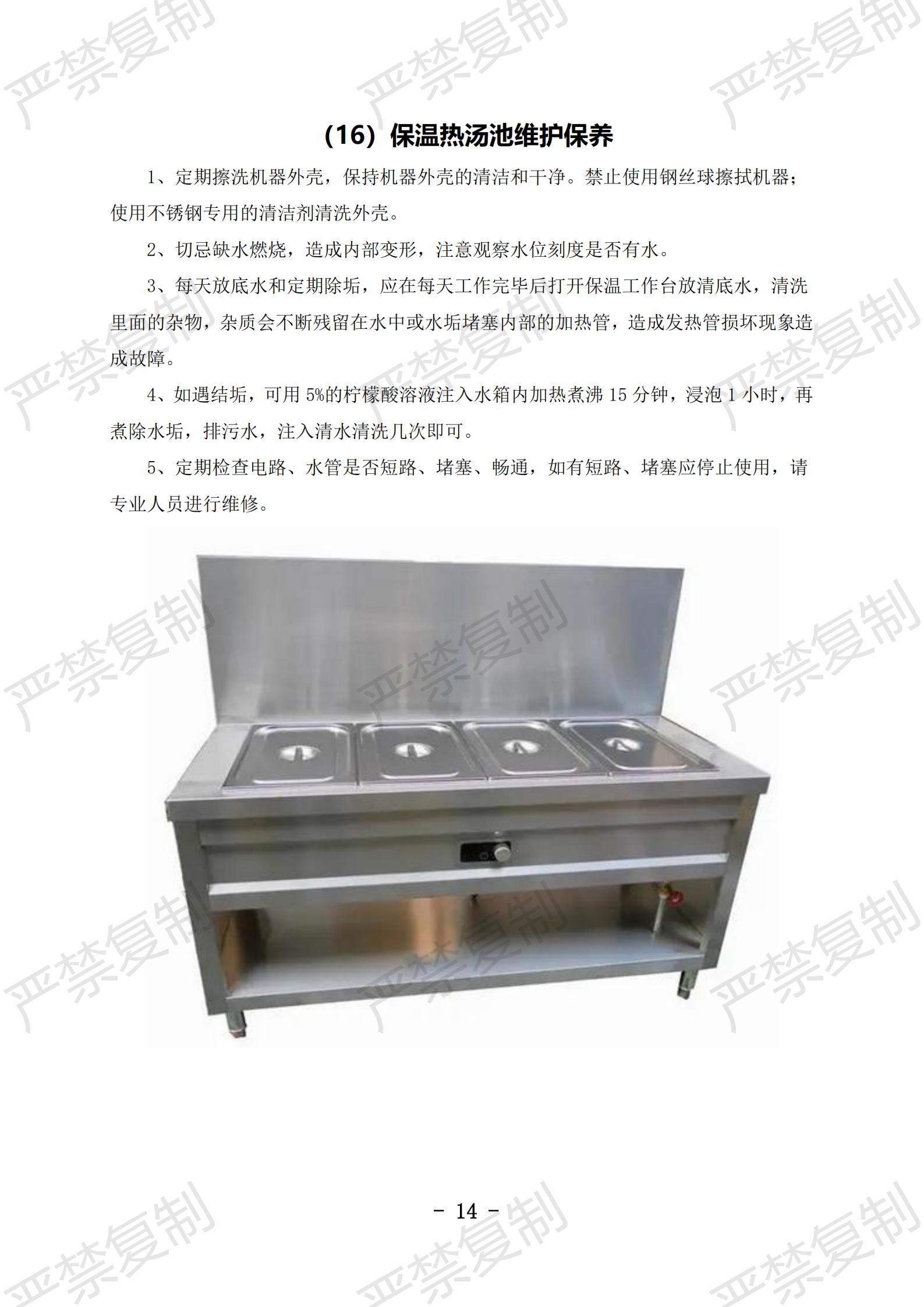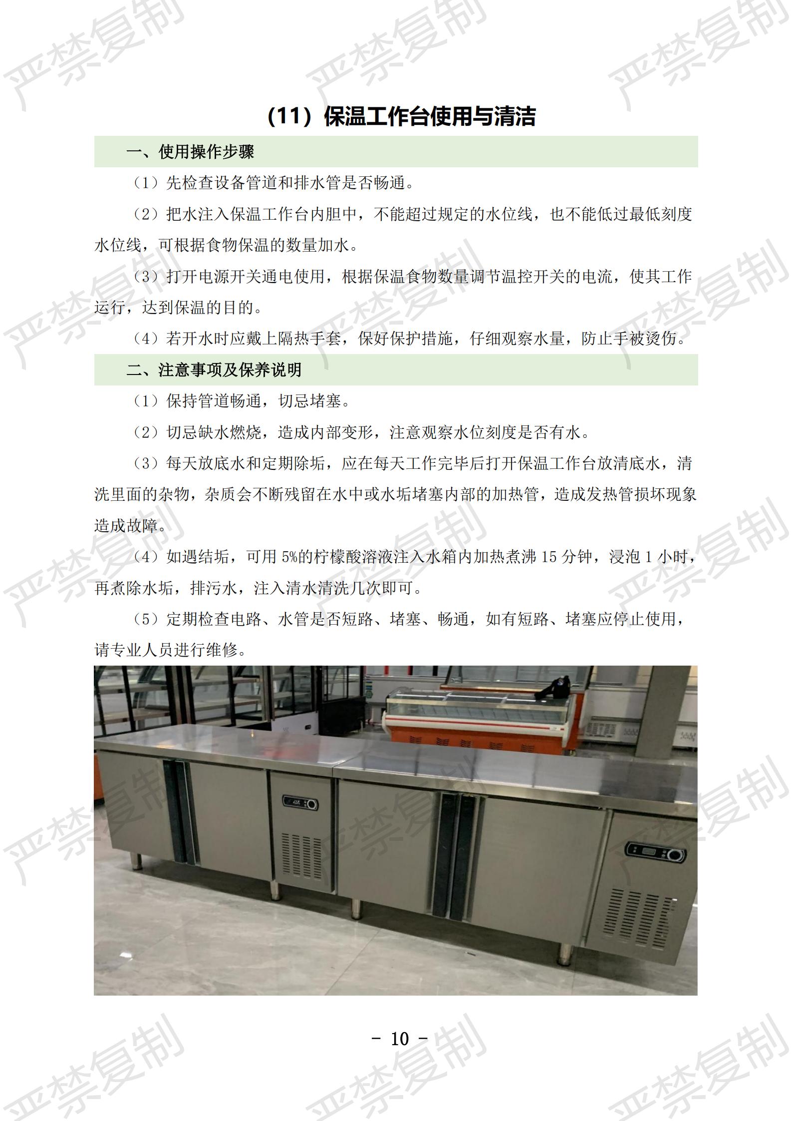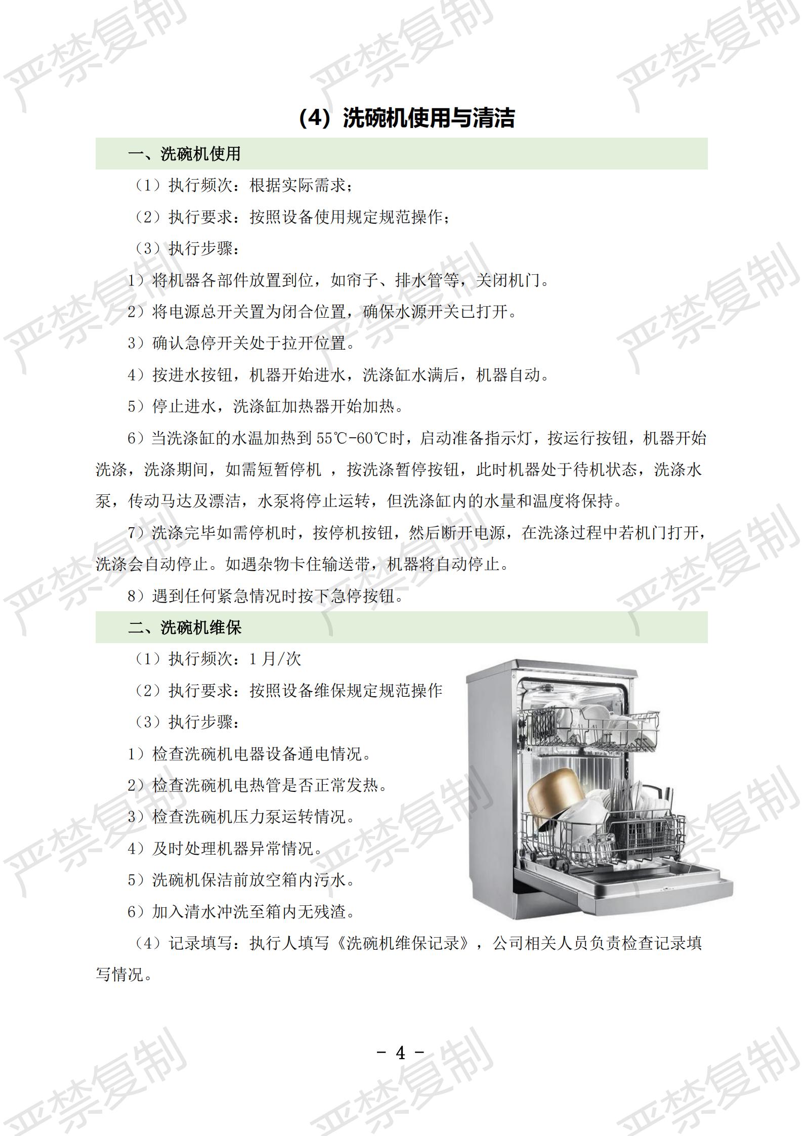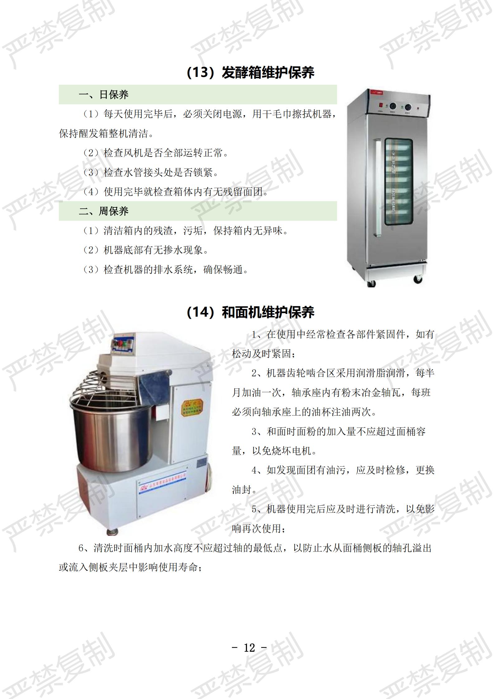 (1)炉灶使用与清洁;(2)冰柜使用与清洁;(3)冷藏库使用与清洁;(4)洗碗机使用与清洁;(5)切片机使用与清洁;(6)豆浆机使用与清洁;(7)果蔬洗菜机使用与清洁;(8)消毒柜使用与清洁;(9)垃圾处理库使用与清洁;(10)隔油池清理;(11)保温工作台使用与清洁(12)双层电烤箱维护保养;(13)发酵箱维护保养;(14)和面机维护保养;(15)压面机维护保养;(16)保温热汤池维护保养;