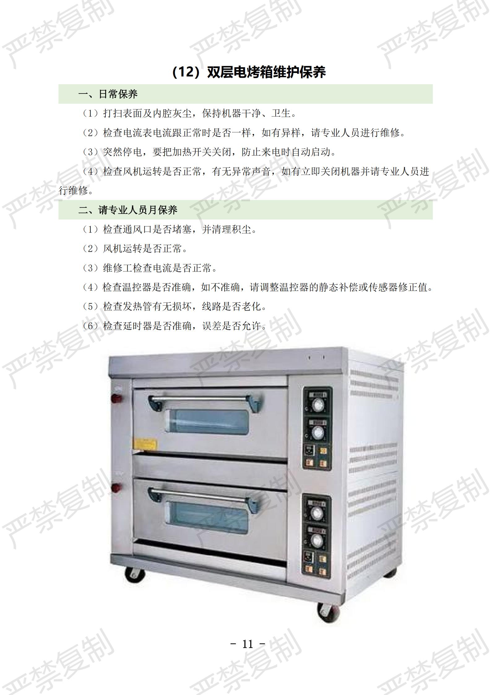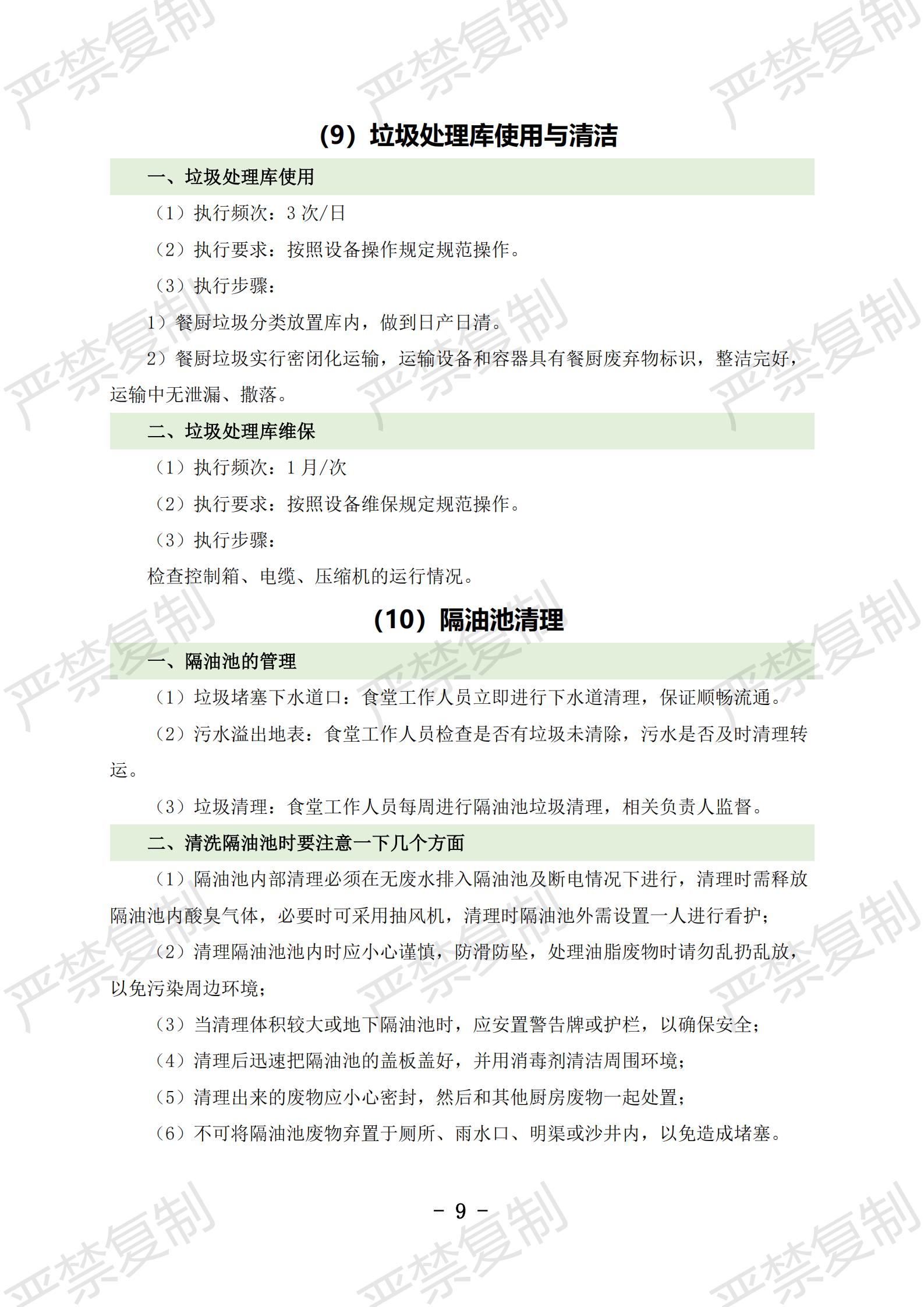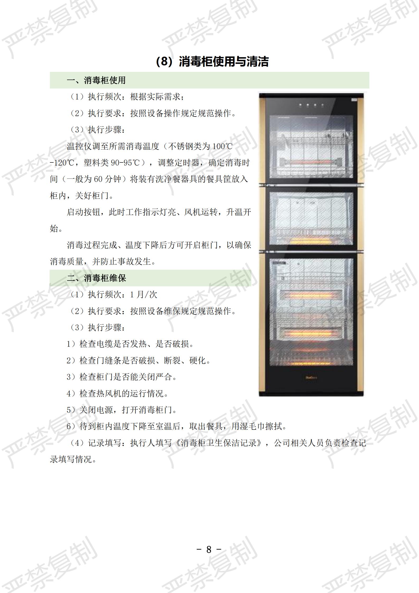 (1)炉灶使用与清洁;(2)冰柜使用与清洁;(3)冷藏库使用与清洁;(4)洗碗机使用与清洁;(5)切片机使用与清洁;(6)豆浆机使用与清洁;(7)果蔬洗菜机使用与清洁;(8)消毒柜使用与清洁;(9)垃圾处理库使用与清洁;(10)隔油池清理;(11)保温工作台使用与清洁(12)双层电烤箱维护保养;(13)发酵箱维护保养;(14)和面机维护保养;(15)压面机维护保养;(16)保温热汤池维护保养;