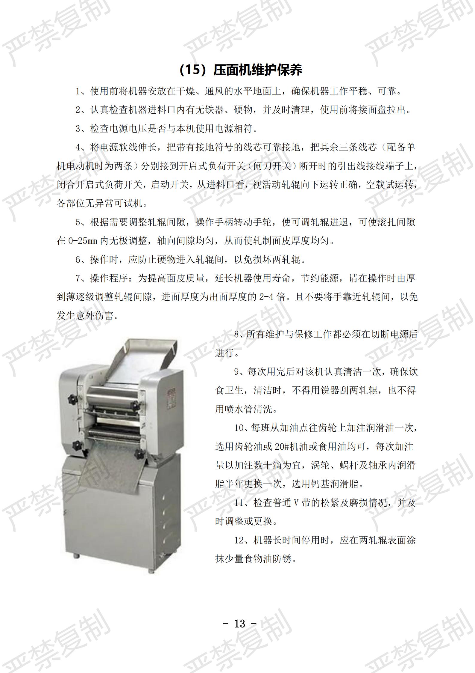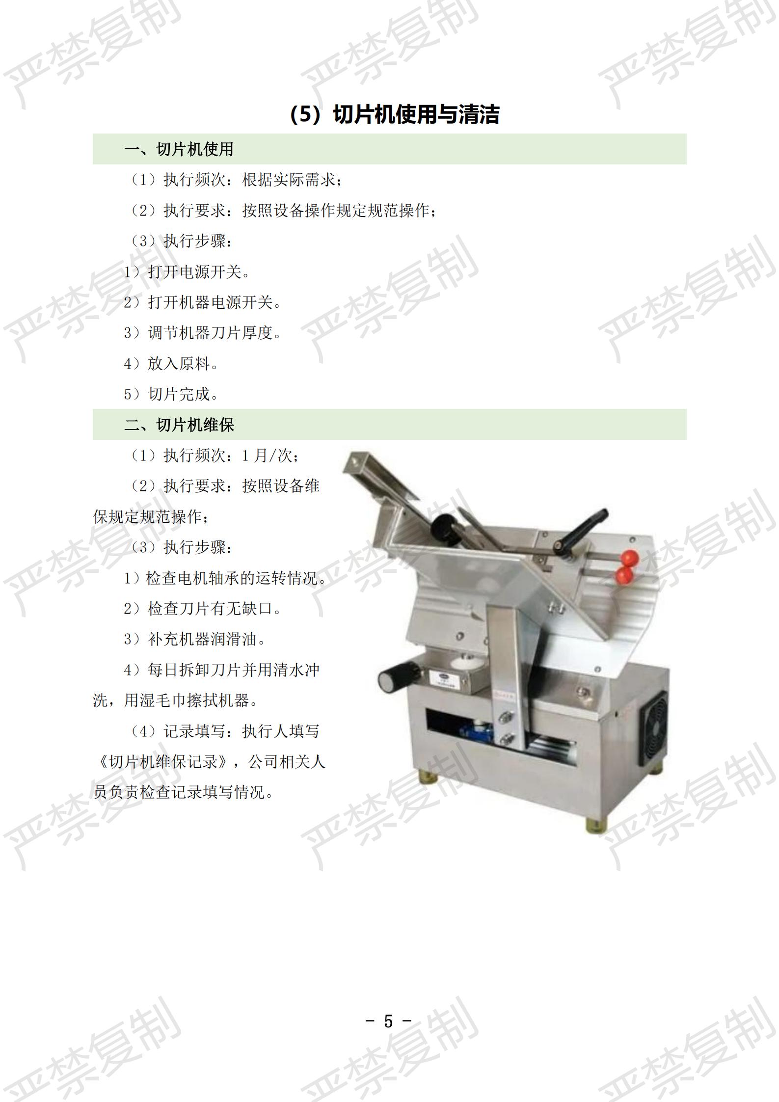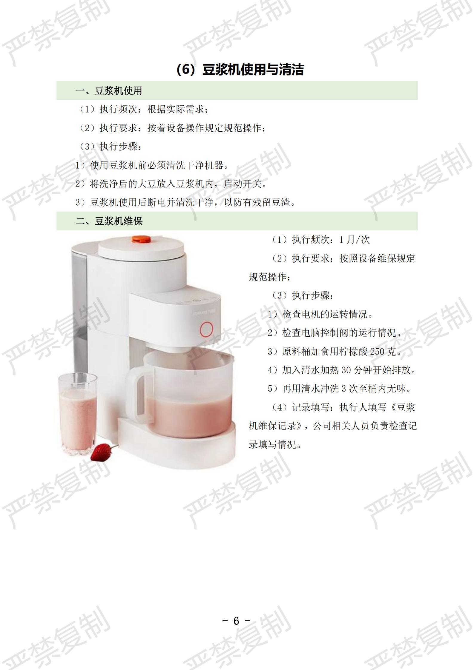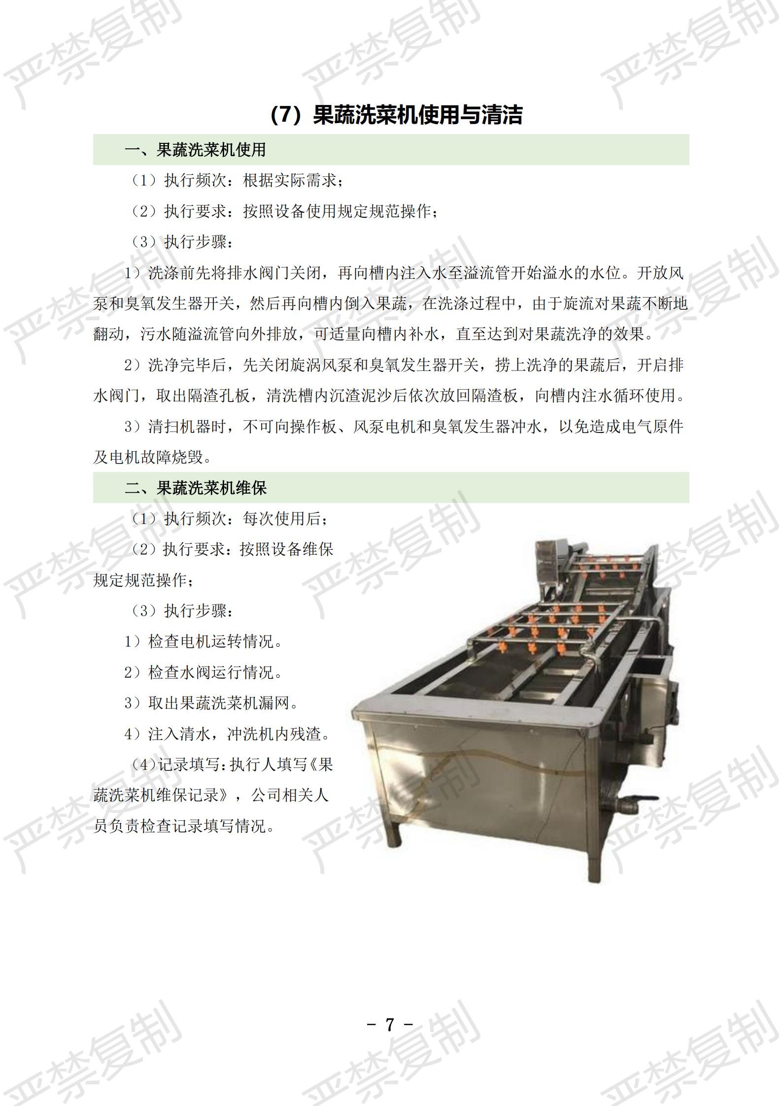 (1)炉灶使用与清洁;(2)冰柜使用与清洁;(3)冷藏库使用与清洁;(4)洗碗机使用与清洁;(5)切片机使用与清洁;(6)豆浆机使用与清洁;(7)果蔬洗菜机使用与清洁;(8)消毒柜使用与清洁;(9)垃圾处理库使用与清洁;(10)隔油池清理;(11)保温工作台使用与清洁(12)双层电烤箱维护保养;(13)发酵箱维护保养;(14)和面机维护保养;(15)压面机维护保养;(16)保温热汤池维护保养;
